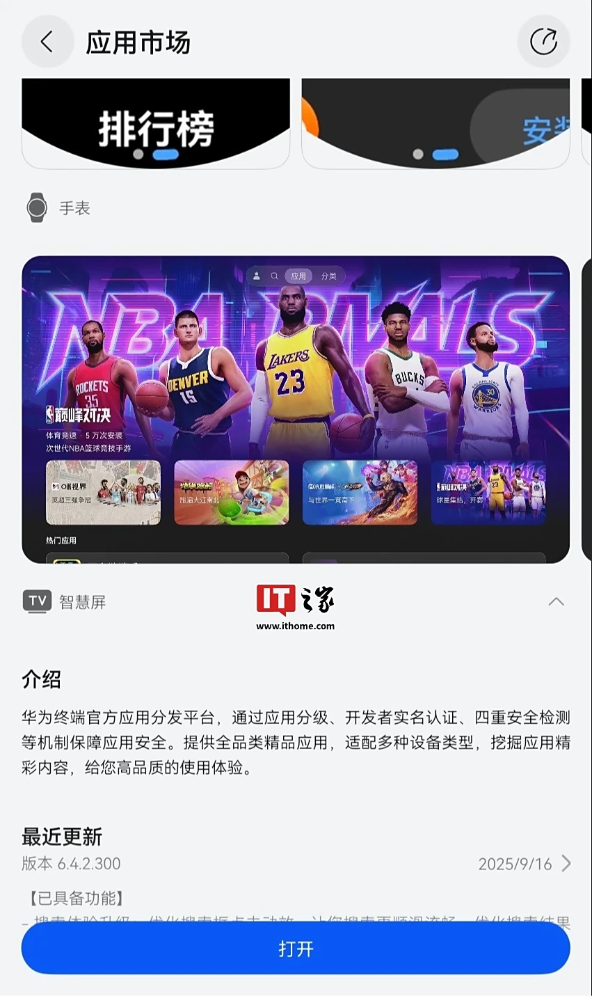 根据相关页面截图来看,当前华为应用市场 App Gallery 的版本号为 6.4.2.300,更新时间为 2025 年 9 月 16 日,参考IT之家此前报道时的截图来看,智慧屏类别产品显示确实是近期刚加入的,预计该功能为提前预埋,或通过后期热更新支持。